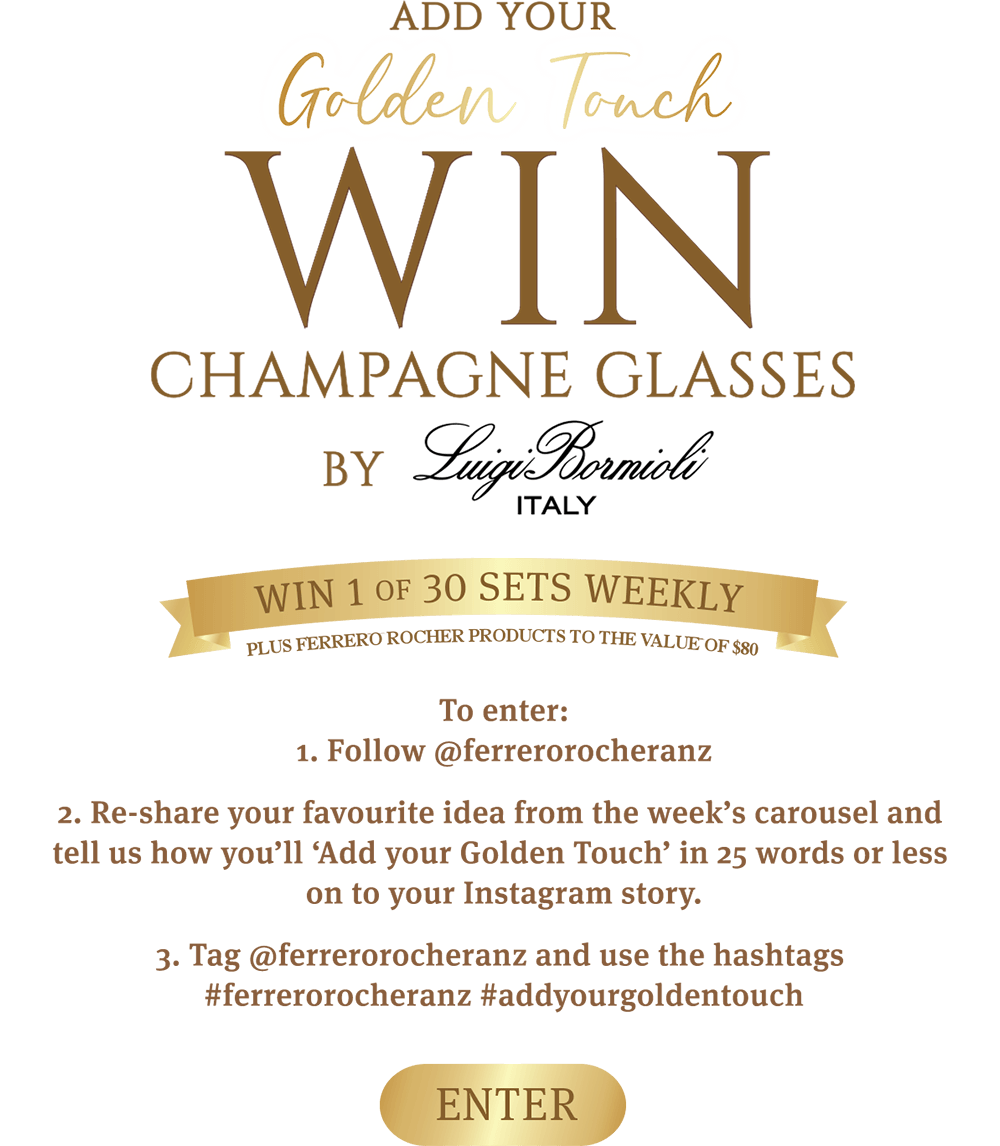 3. share the Promotional Post as their Instagram story with an answer to the following question ‘Tell us in 25 words or less how you will ‘Add your Golden Touch’ to Christmas’ and the following tags: #ferrerorocheranz, #addyourgoldentouch and tag @ferrerorocheranz; and